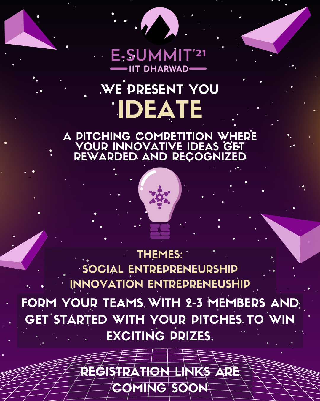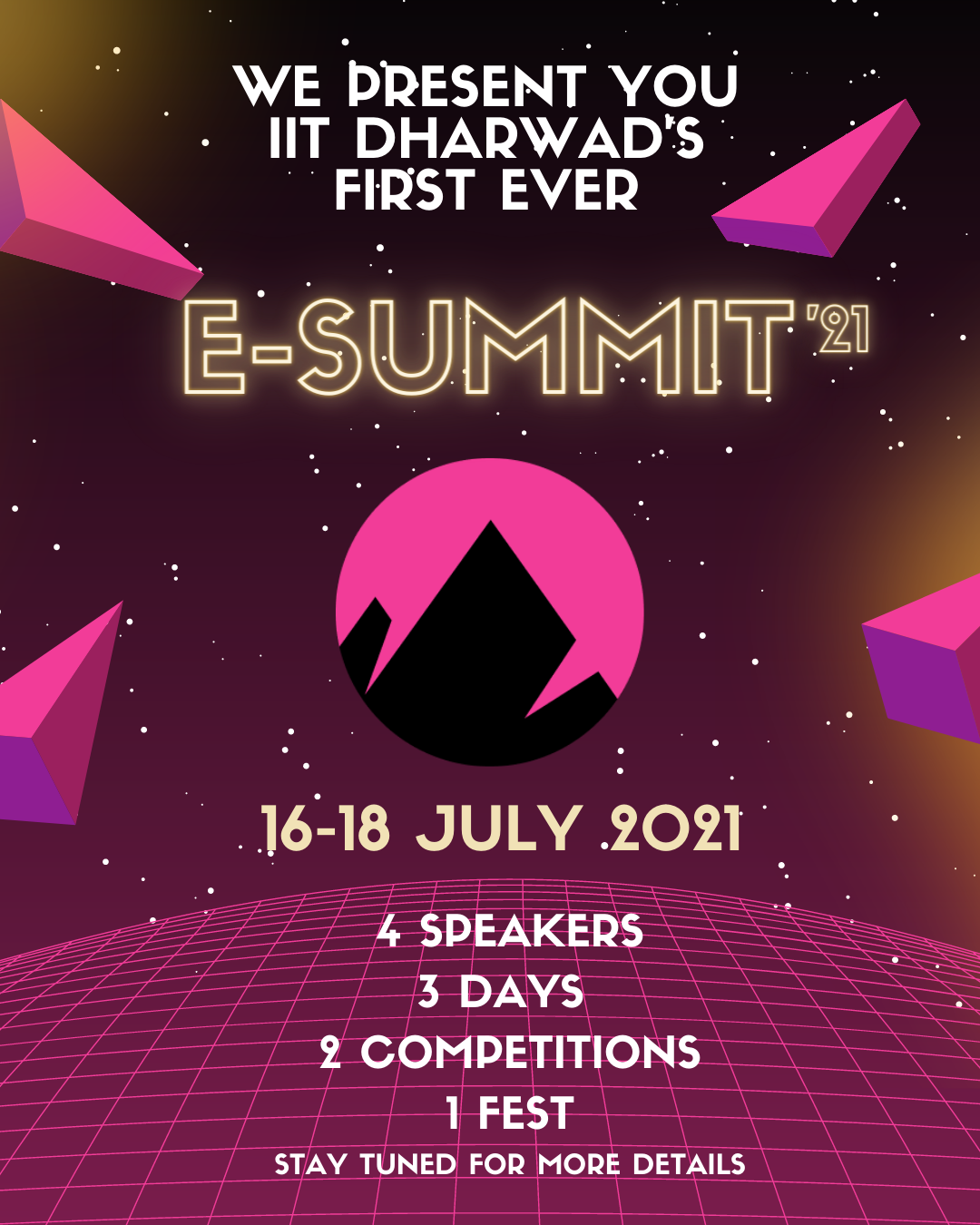 The Institute Innovation Council is on its way to host IIT Dharwad’s very first entrepreneurial fest “E-Summit 2021”, featuring well-known personalities who will provide an insight into many things, empowering students to foster and nurture their creative ideas, innovations, and unique talents.Get ready for three days of fun whilst being productive, take part in competitions, quizzes, amazing prizes, and much more, it'll be an engaging and competitive experience.