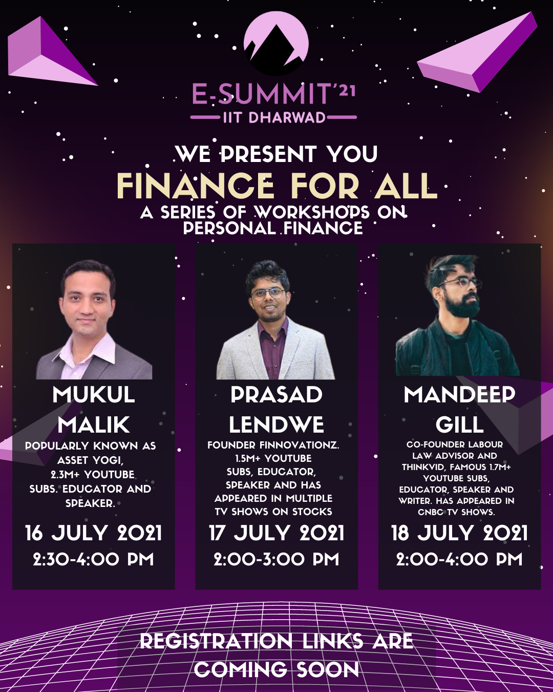 A series of workshops on Personal Finance that will address the methodologies which can be adopted by anyone, especially undergraduates to generate wealth in their life, manage their income and savings. Top Educators in this field will teach you proven and modern steps for better money management.